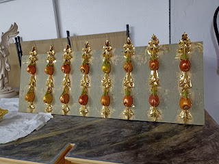 - Charolado( barnizado) en color caoba por completo del paso y dorado en oro de ley y estofado de los óvalos , guirnaldas, conchas y detalles del paso .
